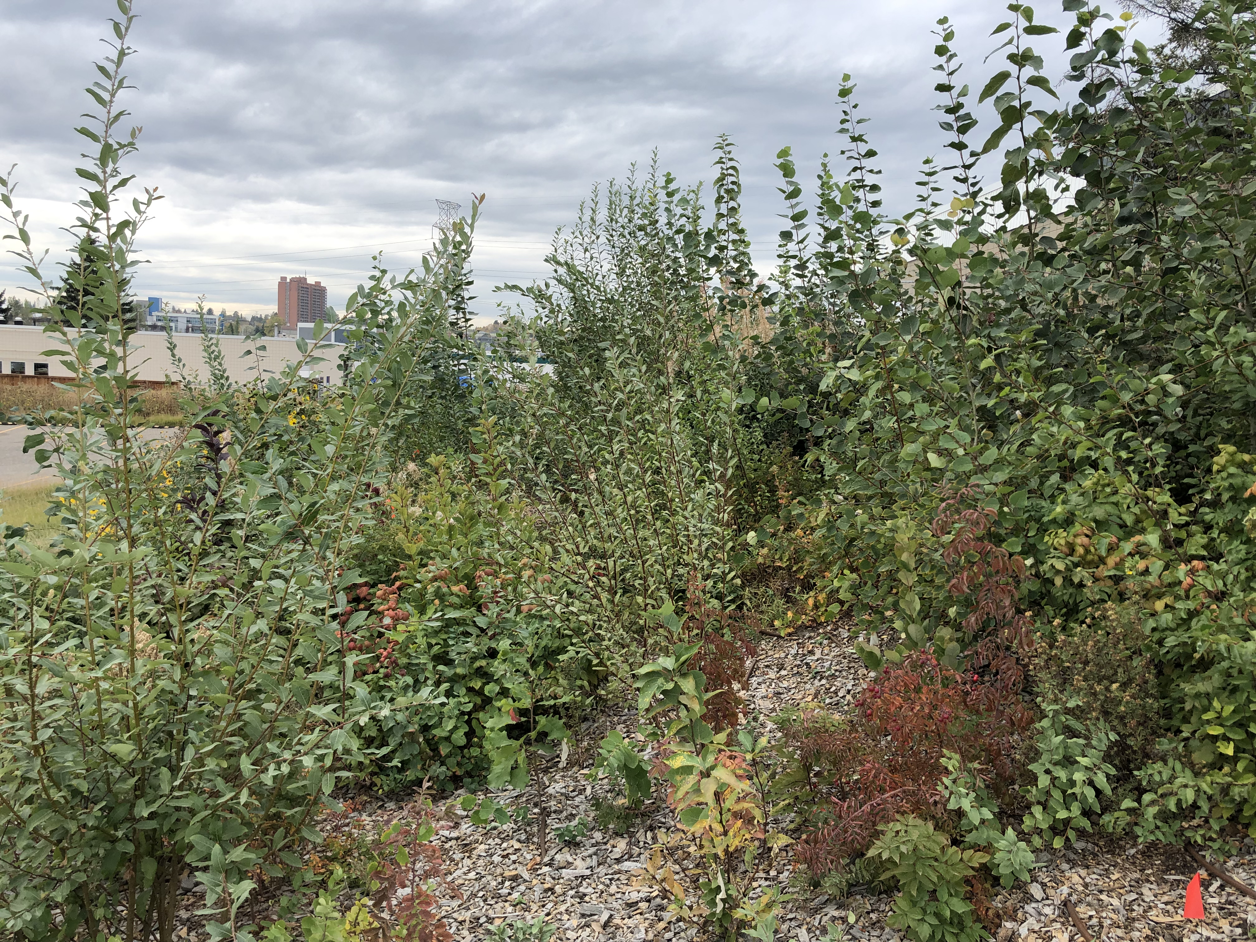 This is the mini forest Pokitso’wa’ssko, “Tiny Beautiful Place” in Blackfoot. It was planted in 2023 at the Calgary Centre for Spiritual Living, as part of the Calgary Climate Hub’s Mini-Forests for Calgary initiative, in collaboration with Green Communities Canada, Definity Insurance Foundation and All One Fund Calgary CSL. As members of the Hub’s planting team (and the fencing team who returned a year later, to better protect the plantings from enthusiastic rabbits!), we decided to revisit the mini forest in autumn 2025.