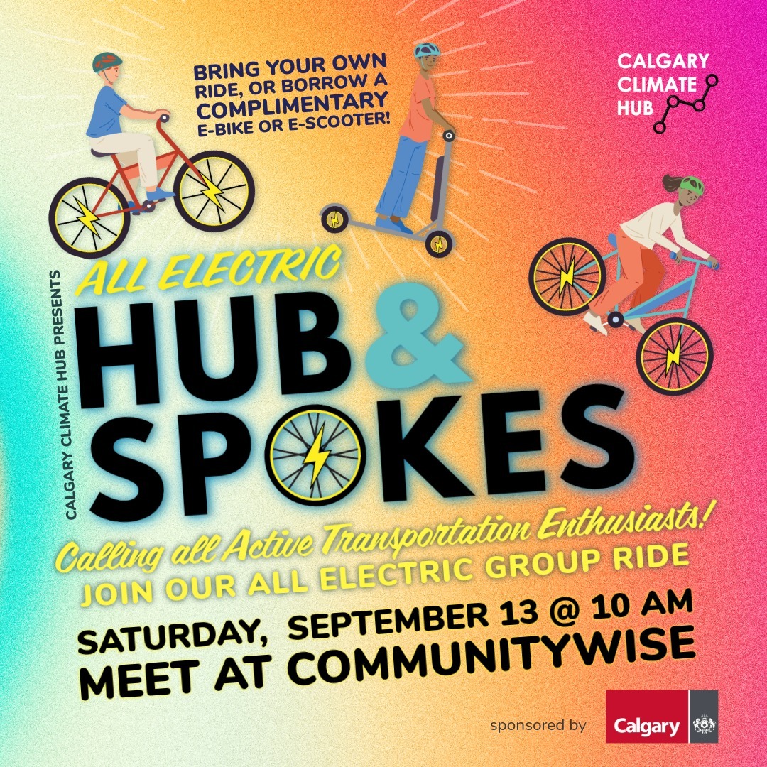 Our Hub & Spokes group rides offer guided tours around Calgary's 5A pathway network, exploring ways to get around Calgary in a dynamic and climate-smart way.This upcoming Hub & Spokes is ALL-ELECTRIC, showcasing e-bikes and e-scooters as a reliable and sustainable mode of transportation!
