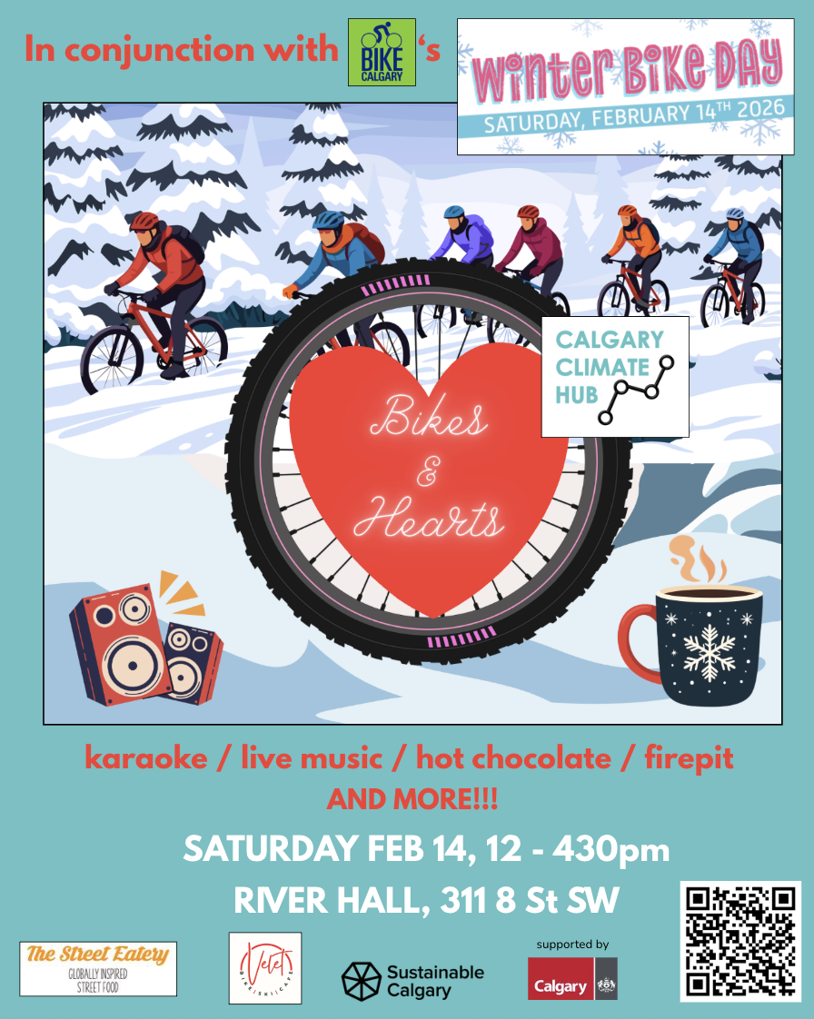 This Valentine's Day come be OUR Valentine! This February 14th, in conjunction with Bike Calgary's Winter Bike Day YOUR Calgary Climate Hub is hosting a FREE, SUPER FUN outdoor WINTER PARTY and YOU are invited! This event is open to all modes of mobility (walkers too!) at River Hall along the Bow River Pathway so COME ONE COME ALL!!!